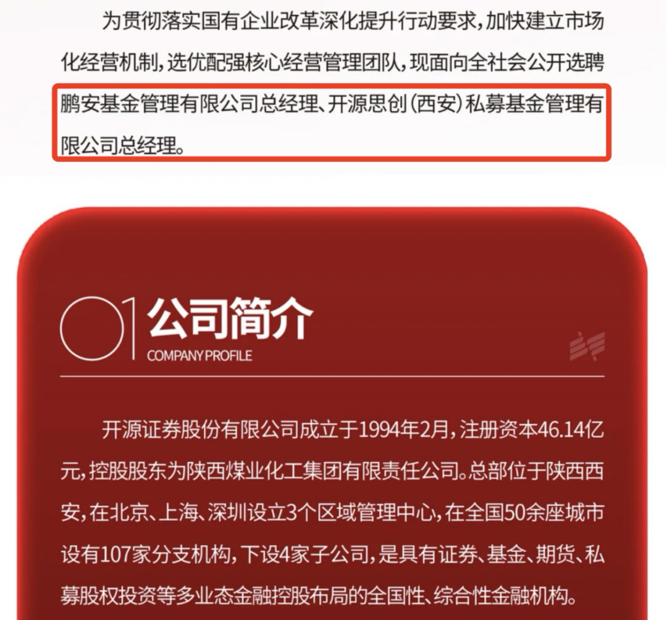 近期,开源证券同时发布旗下控股公募基金——鹏安基金,以及私募基金——开源思创私募基金的总经理岗位招聘。