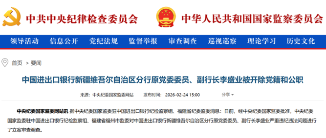 2月24日,中央纪委国家监委官网通报:中国进出口银行新疆维吾尔自治区分行原党委委员、副行长李盛业被开除党籍和公职。