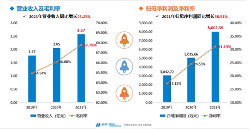 根据年报数据显示,2021年东华测试全年实现营业收入2.57亿元,同比增长25.22%,其中归属于上市公司股东净利润8002.39万元,同比增长58.91%,扣非净利润7703.91万元,同比增长73.57%。放眼2021年全球经济环境恶化的背景下,东华测试的业绩增长非常亮眼。