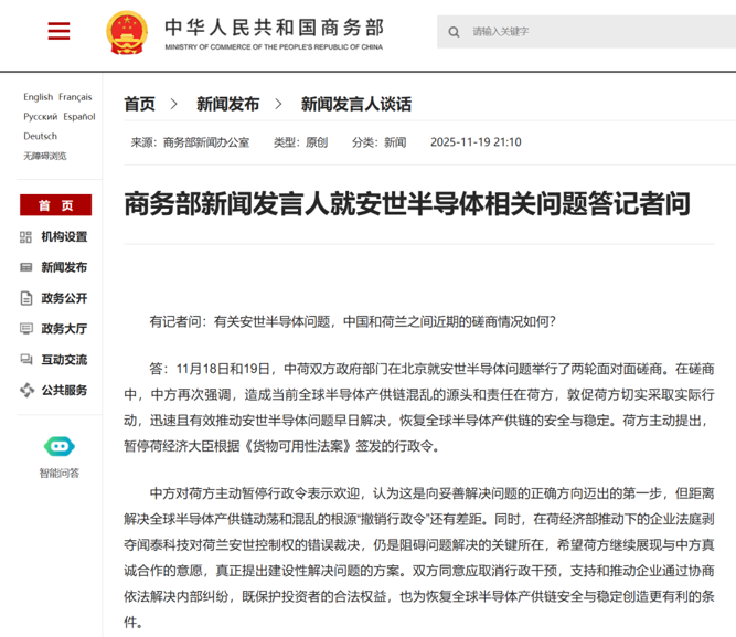 11月19日,商务部官网发布商务部新闻发言人就安世半导体相关问题答记者问。
