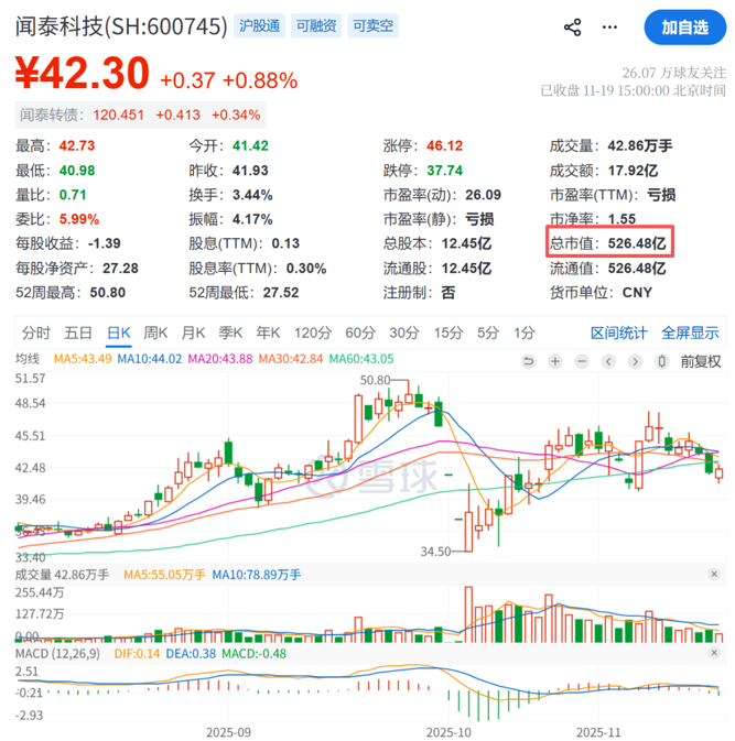 进入四季度以来,闻泰科技股价反复震荡。截至11月19日收盘,闻泰科技报42.3元/股,总市值为526亿元。