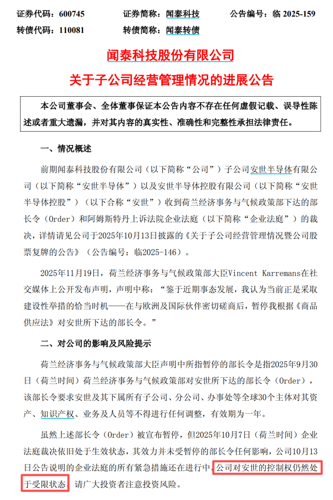 【导读】闻泰科技最新公告:对安世控制权仍然受限