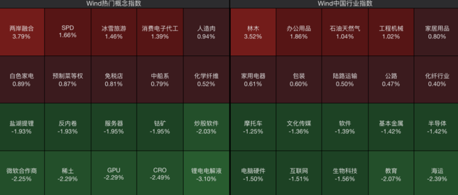 从板块看,福建本地股走强,冰雪旅游、免税店、消费电子代工等板块震荡拉升;而海运、教育、锂电等板块走低。