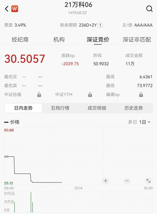 深交所公告称,“21万科06”(149568)盘中成交价较前收盘价首次下跌达到或超过30%,根据《深圳证券交易所债券交易规则》和《关于对债券匹配成交实施盘中临时停牌有关事项的通知》等有关规定,本所自今日10时22分33秒起对该债券实施临时停牌,于15时27分00秒复牌。