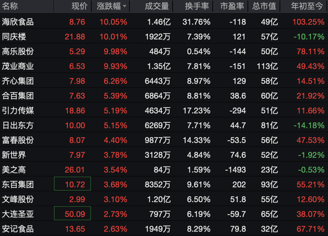 部分消费股走高,海欣食品、同庆楼、高乐股份涨停,茂业商业、齐心集团、合百集团等跟涨。