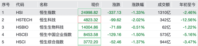 港股市场同样下跌。截至发稿,恒生指数跌1.33%,恒生科技跌2.02%,恒生生物科技跌0.51%。个股方面,泡泡玛特跌超8%,快手跌超13%,中国人寿跌超7%,中芯国际、老铺黄金跌超4%。