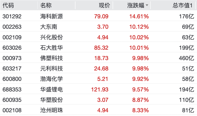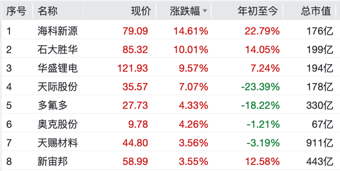 个股方面,石大胜华录得10cm涨停,海科新源涨超14%,华盛锂电涨超9%,天际股份涨超7%,奥克股份、多氟多、天赐材料、新宙邦等均上涨明显。