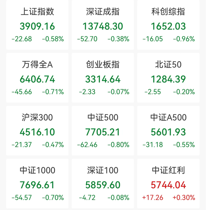 截至午间收盘,沪指跌0.58%,深证成指跌0.38%,创业板指跌0.07%,科创综指跌0.96%。