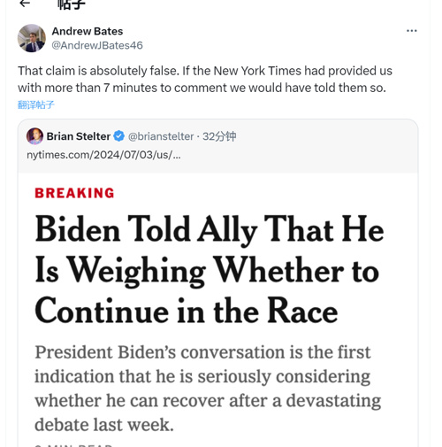 报道出来之后,白宫发言人安德鲁·贝茨在社交媒体上写道:“这一说法绝对是错误的。”
