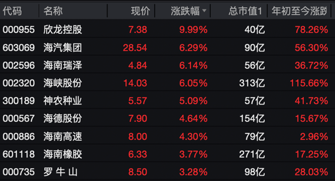 海南自贸区个股方面,康芝药业录得20cm涨停,海马汽车、欣龙控股、海南海药涨停,海汽集团、海峡股份、海南瑞泽、海德股份、海南橡胶、海南高速等跟涨。