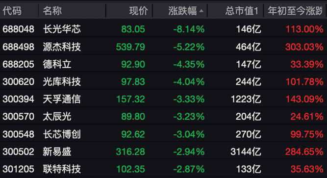 另外,光模块CPO板块持续调整,“易中天”股价纷纷下跌,长光华芯跌超8%。
