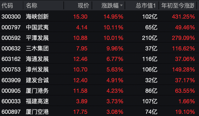 平潭发展录得2连板,海峡环保、日上集团、中国武夷等多股涨停,海峡创新涨超14%,海通发展、漳州发展、福建高速、厦门港务、厦门空港跟涨。
