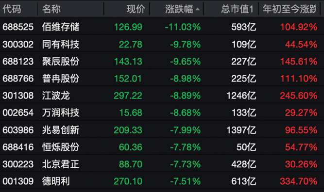 个股方面,兆易创新跌近8%,江波龙跌近9%,佰维存储跌超10%,香农芯创跌超7%。