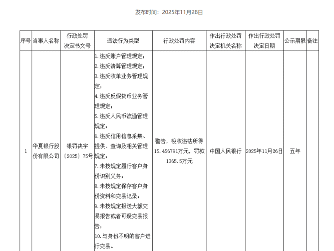 11月28日,中国人民银行发布行政处罚公告显示,因多项业务违规,华夏银行被罚超千万。