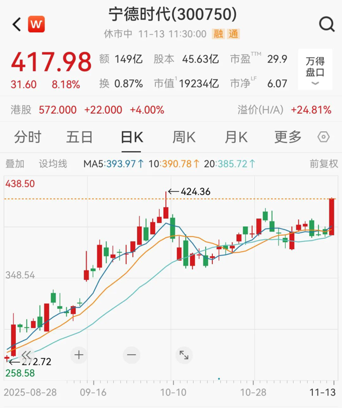 宁德时代大涨8.18%,报417.98元/股,最新市值达19234亿元,年内涨幅超60%。