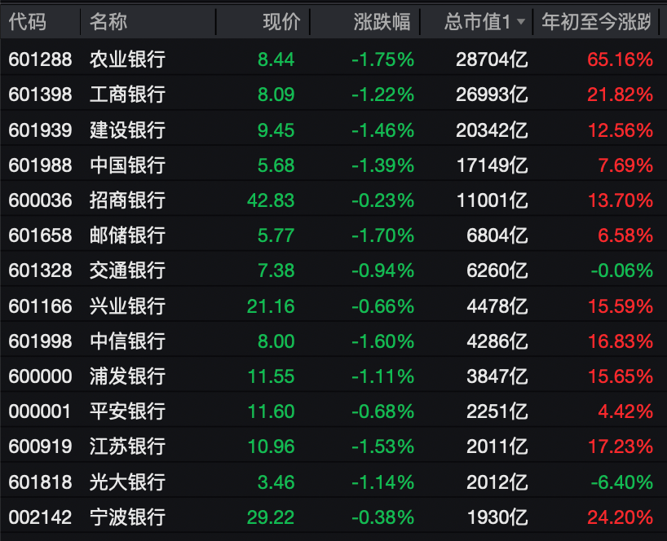 工商银行、建设银行、中国银行、邮储银行、中信银行、光大银行跌超1%,交通银行、江苏银行、宁波银行、上海银行、南京银行等跟跌。
