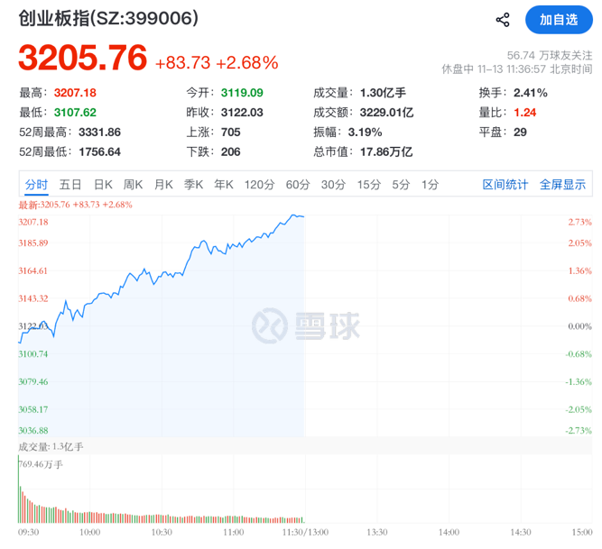 11月13日上午,A股三大股指低开高走,创业板指涨幅扩大至2.68%,沪指重回4000点上方,北证50指数大涨超3%。