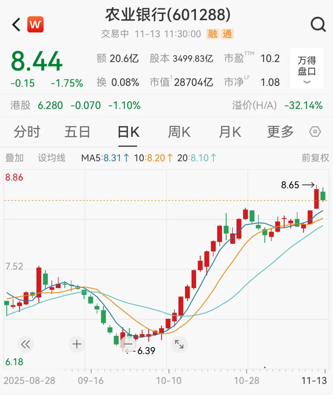 农业银行跌1.75%,报8.44元/股,最新市值为28704亿元。