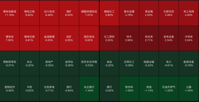 从板块看,新能源板块持续爆发,电池板块拉升走强,能源金属板块领涨,氟化工、存储芯片板块活跃;而银行股全线下跌,公路铁路运输、石油天然气、中药、宠物经济、白色家电等板块走弱。