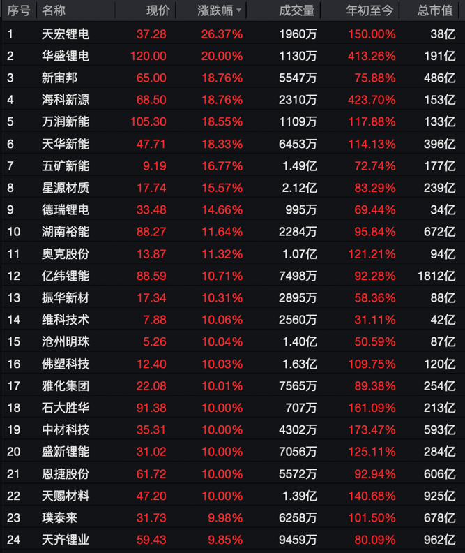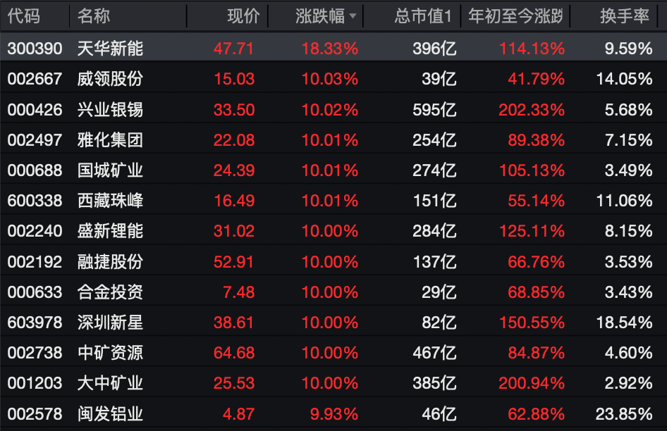天华新能大涨18.33%,威领股份、兴业银锡、雅化集团、国城矿业、西藏珠峰、合金投资、深圳新星、融捷股份、大中矿业、中矿资源、闽发铝业均录得涨停。