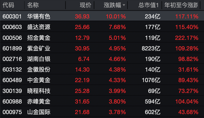 贵金属方面,华锡有色涨停,盛达资源涨近8%,招金黄金、湖南白银、中金黄金、赤峰黄金、晓程科技、山金国际跟涨。