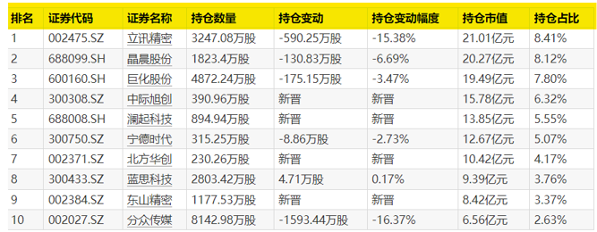 增持方面,与上季度相比,豪威集团、立讯精密、德赛西威、拓普集团、水晶光电获显著加仓,豪威集团获加仓最多,较二季度末增持达52.48%。