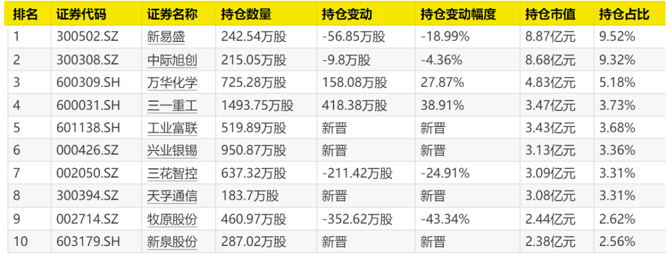 增持方面,与上季度相比,三一重工、万华化学获加仓,加仓幅度为38.91%、27.87%;减持方面,牧原股份、三花智控、新易盛、中际旭创遭不同程度减仓。