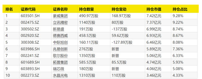 具体来看,前三大重仓股为豪威集团、立讯精密、新易盛,持仓市值在6亿元~8亿元区间;兆易创新、歌尔股份、瑞芯微“新晋”十大重仓股之列。