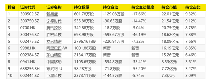 具体来看,前三大重仓股为新易盛、宁德时代、腾讯控股,持仓市值在20亿元~23亿元区间不等;阿里巴巴-W、东山精密“新晋”十大重仓股之列。