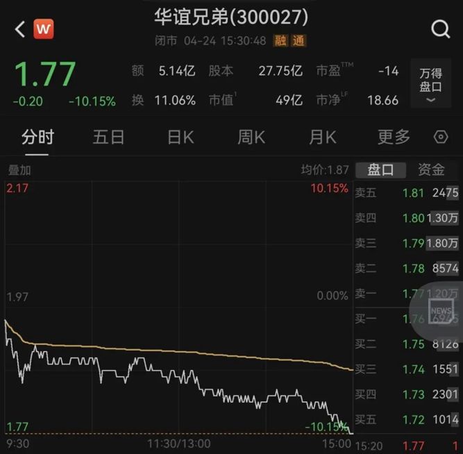 4月24日,华谊兄弟收于1.77元/股,单日下跌10.15%,总市值为49亿元。