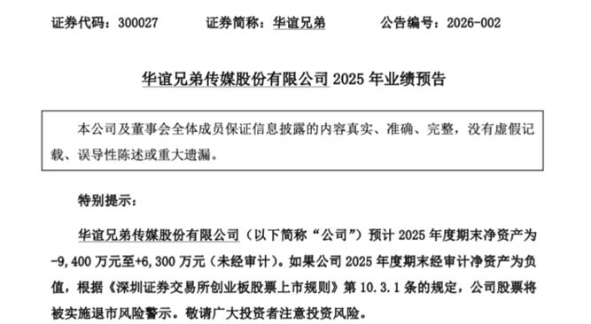 更致命的是,根据公司业绩预告,2025年末净资产预计为-9400万元至6300万元。若经审计净资产最终为负值,华谊兄弟将在年报披露后被实施退市风险警示(*ST)。