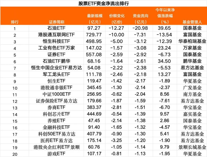 此外,股票ETF中,当日23只股票ETF净流出超过1亿元,石油、互联网、恒生科技、工业有色、证券等行业主题ETF是资金净流出较多的品种。
