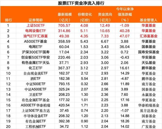 部分资金择机入场。上周五全市场股票ETF(含跨境ETF)资金净流入近33亿元。中证A500、上证50等宽基ETF,以及电网设备、现金流等行业主题ETF资金净流入靠前,石油、互联网、恒生科技、工业有色、证券等行业主题ETF是资金净流出较多的品种。