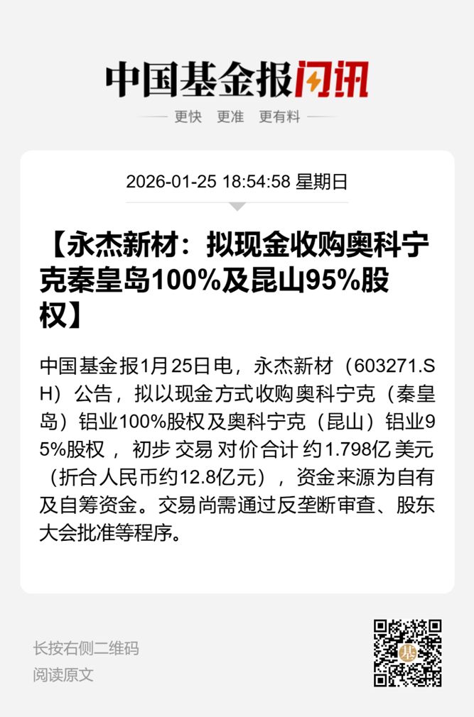 1月25日晚间,永杰新材发布的重大资产购买预案显示,公司拟以支付现金的方式,购买奥科宁克(中国)投资有限公司的两项资产,预计构成重大资产重组。