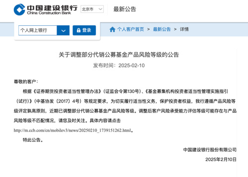 公告显示,根据《证券期货投资者适当性管理办法》《基金募集机构投资者适当性管理实施指引(试行)》等规定要求,为切实履行适当性义务,保护投资者权益,建设银行遵循产品风险等级评定孰高原则,近期已调整部分代销公募基金产品风险等级。