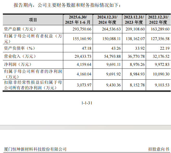 2022年至2024年及2025年上半年,恒坤新材的营业收入分别为3.22亿元、3.68亿元、5.48亿元及2.94亿元,扣非后净利润分别为9103.53万元、8152.78万元、9430.36万元及3073.97万元。