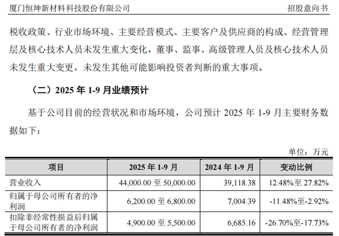 招股意向书显示,恒坤新材预计其2025年前三季度的营业收入为4.4亿元至5亿元,同比变动率为12.48%至27.82%;扣非后净利润为4900万元至5500万元,同比变动率为-26.70%至-17.73%。