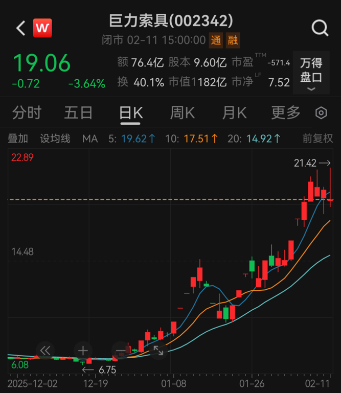 2025年12月1日至2026年2月11日,商业航天概念股巨力索具股价大涨162.90%,其间多次触及股票交易异常波动情形。