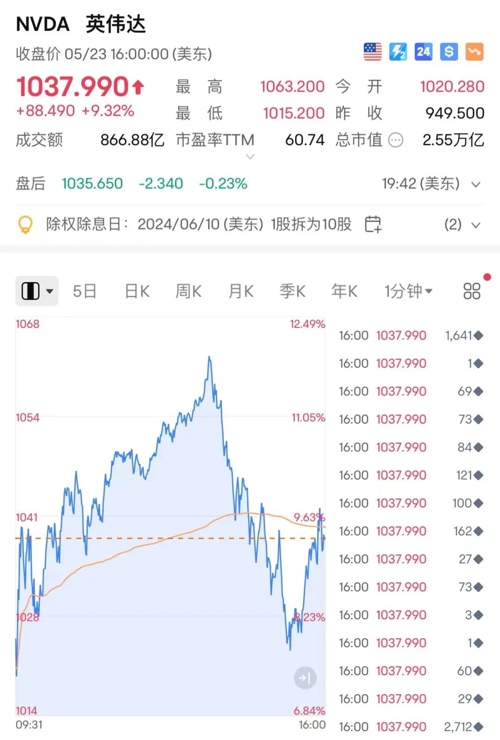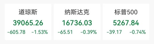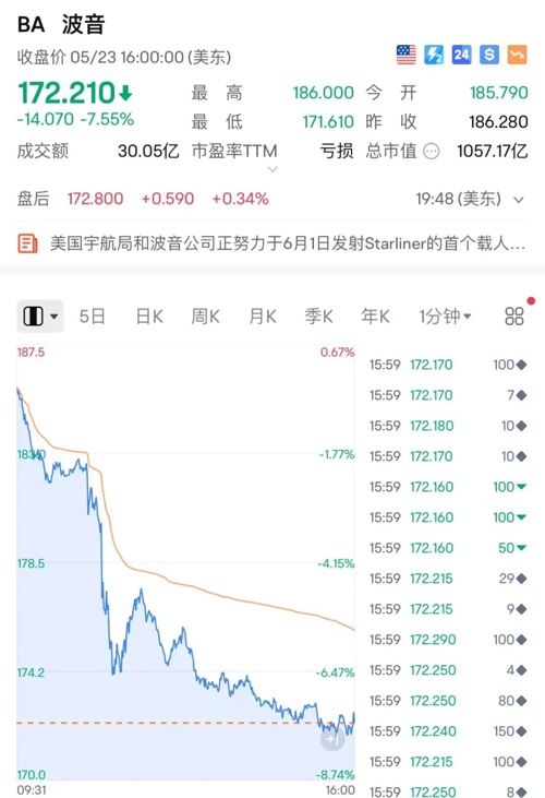 美东时间5月23日,市场数据再度给降息预期泼冷水,美三大指数集体跳水收跌,道指重挫超600点,创2023年3月以来最大单日跌幅。AI龙头英伟达“一枝独秀”大涨超9%,市值一夜大涨近2200亿美元(约人民币近1.6万亿元)。黄仁勋身家达910多亿美元,位列全球富豪榜第17名。高管称二季度现金消耗更糟糕且交付量止步不前,波音大跌7.55%领跌道指,创最近四个月最差单日表现。美东时间5月23日,隔夜美联储会议纪要暗示决策者需等更久才会考虑降息后,当日标普全球公布的美国5月综合PMI初值超预期升至54.4,显示5月美国商业活动增长大幅加速,创两年多来最快。同时,分项指数显示价格上涨、通胀升温。综合产出指数从4月的51.3大幅上升至5月的54.4,为2022年4月以来的最高水准。上升3.1个指数点标志第二季中期经济增长明显加速。产出现已连续16个月持续增长,其中5月的加速增长与3月和4月的放缓形成鲜明对比。 数据公布后,交易员们将美联储首次降息时间预估从11月直接推迟到12月。美股三大指数携手跳水,最终集体收跌。截至收盘,道指收跌605.78点,跌幅达1.53%,创2023年3月以来最大百分比跌幅;标普收跌0.74%,报5267.84点;纳指收跌0.39%,报16736.03点。美东时间5月23日,昨日盘后公布亮眼财报的英伟达逆势大涨超9%,股价突破历史性的1000美元,市值一夜大涨近2200亿美元(约人民币近1.6万亿元)至2.55万亿美元。英伟达第一财季营收同比增长262%,达260.44亿美元。数据中心营收同比增长427%,增至226亿美元,市场预期为221亿美元,创历史新高。净利润同比增长628%,达148.81亿美元。 该公司预计第二财季营收280亿美元,高于伦敦证交所集团(LSEG)调查得到的平均预期值266.1亿美元。这一迹象表明英伟达公司并不认为业绩强劲增长势头放缓。市场预计该公司第二财季每股收益5.95美元。高盛将英伟达最新的12个月目标价设定至1100美元(3月前为875美元),机构提升了其2025年到2027年财年的EPS(每股盈利)预测,提升幅度平均为8%。根据福布斯实时富豪榜,黄仁勋身家达910多亿美元,位列全球富豪榜第17。美东时间5月23日,波音大跌7.55%领跌道指,创最近四个月最差单日表现。 消息面上,波音公司首席财务官Brian West在沃尔夫全球运输与工业会议上表示,预计第二季度的现金消耗可能比第一季度稍差,2024年的自由现金流将为负值。 此外,由于中国监管机构对驾驶舱语音记录仪电池的审查,波音向中国的飞机交付近几周被推迟。这家美国飞机制造商在一份声明中说,它正与中国客户商讨交货时间,目前中国民用航空局正对25小时驾驶舱语音记录仪内的电池进行审查。波音在2023年底提交的一份文件中说,它有大约140架737 MAX 8型飞机的库存,其中85架飞机是供中国客户的。截至4月底,波音今年已向中国交付了22架飞机,但最近几周由于等待此前未被报道的审查,波音尚未向中国客户交付任何新飞机。5月23日,国际黄金、白银价格继续大跌。COMEX黄金期货跌2.6%,报2330.6美元/盎司;COMEX白银期货跌3.72%,报30.325美元/盎司。贵金属已经连续两日重挫。