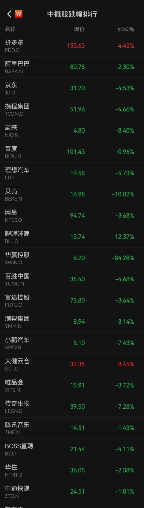 5月23日,中概股普遍下跌,纳斯达克中国金龙指数跌3.71%,华赢控股跌84.28%,海川证券跌20.89%,哔哩哔哩跌12.37%,贝壳跌10.02%。