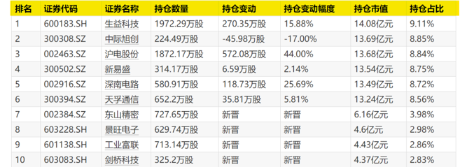 深南电路、阳光电源、浪潮信息、东山精密新晋十大重仓股之列。