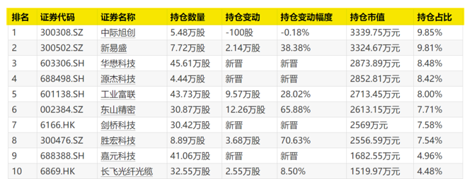 中际旭创被小幅减持,华懋科技、源杰科技、剑桥科技、嘉元科技新晋十大重仓股。