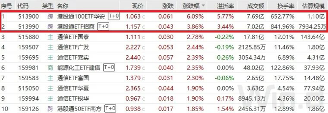 正因为AH股市场存在交易的时间差,场内一些投机资金又乘着这个时点拉高场内港股ETF,港股通100ETF华安、港股通ETF招商两只ETF全天大涨6.09%、3.86%,霸榜今日ETF涨幅榜第一、第二名,溢价率分别达到5.77%、3.44%,换手率更是飙升至600%、800%之上。