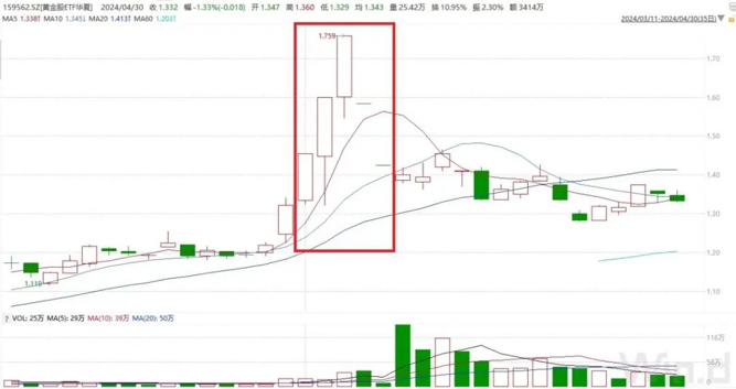 例如,2024年4月1日至4月3日,华夏黄金股ETF在三个交易日里连续涨停,截至4月3日,六个交易日累计涨幅高达47.32%,溢价率一度飙升至30.50%。4月8日至9日,华夏黄金股ETF开始连续两个跌停,高位进场的投资者一度被套牢。
