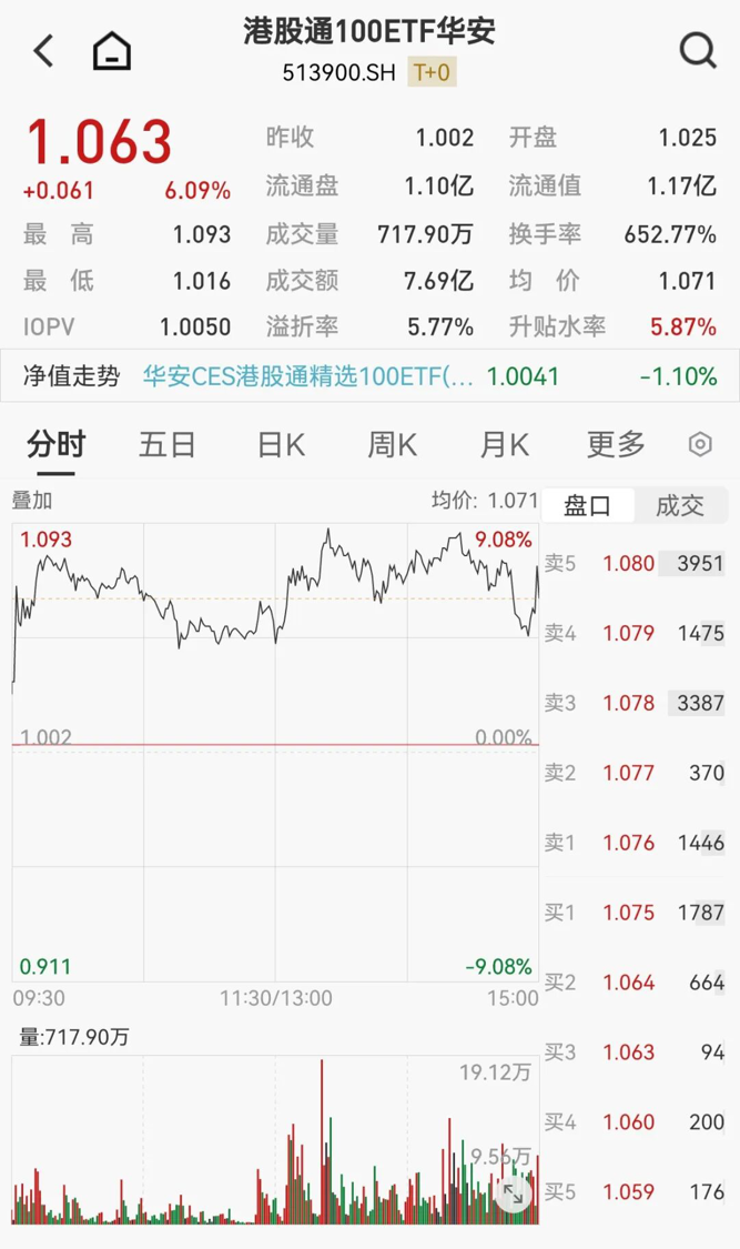早间开盘,多只“迷你”港股ETF就被场内投资资金盯上。开盘两分钟,港股通100ETF华安场内价格迅速拉高至1.068元,溢价率飙升至6.59%,之后持续震荡走高。下午开市,溢价率一度拉高至8.88%,尾盘有所回落。Wind数据显示,截至收盘,港股通100ETF华安报收于1.063元/股,溢价率达到5.77%。