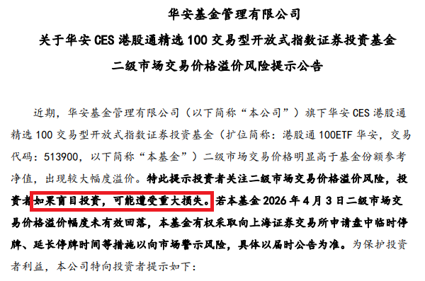 对此,华安基金发布风险提示公告,提示投资者关注二级市场交易价格溢价风险,投资者如果盲目投资,可能遭受重大损失。