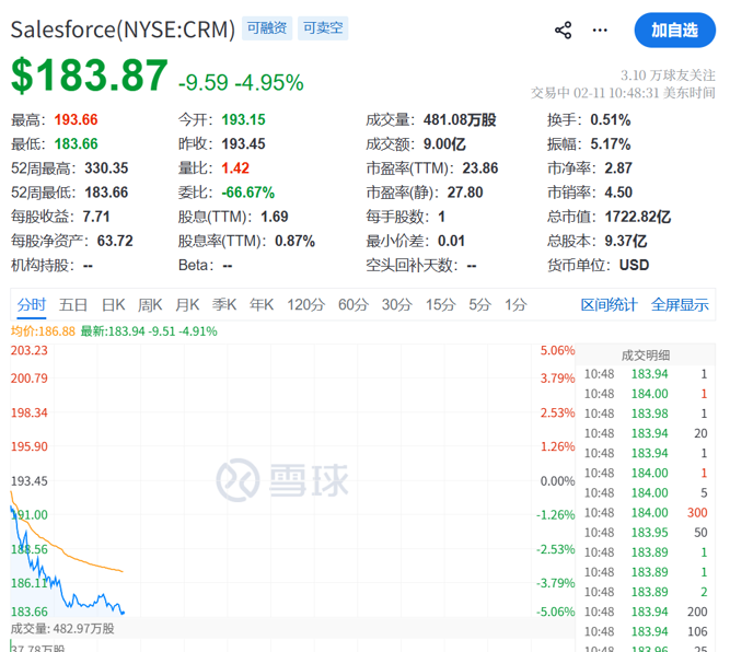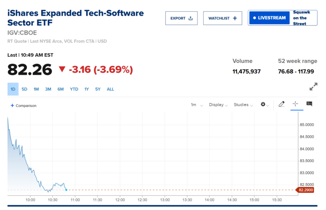 此外,今晚美股的跳水,有一部分原因是软件股又遭到了抛售,Salesforce下跌约5%,ServiceNow下跌6%。iShares扩展科技软件行业ETF(IGV)下跌3%,较52周高点回撤30%;该基金上月已进入熊市区间。