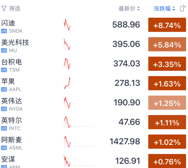 相反,受益于经济加速的股票以及参与AI数据中心建设的相关公司则走强。闪迪、美光科技、台积电等硬件股仍保持涨势。