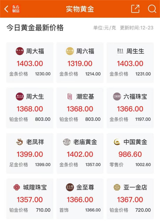 实物黄金方面,12月23日,多家品牌黄金报价已突破1400元/克,再创历史新高。其中,周大福、周生生报1403元/克,老庙黄金报1402元/克。