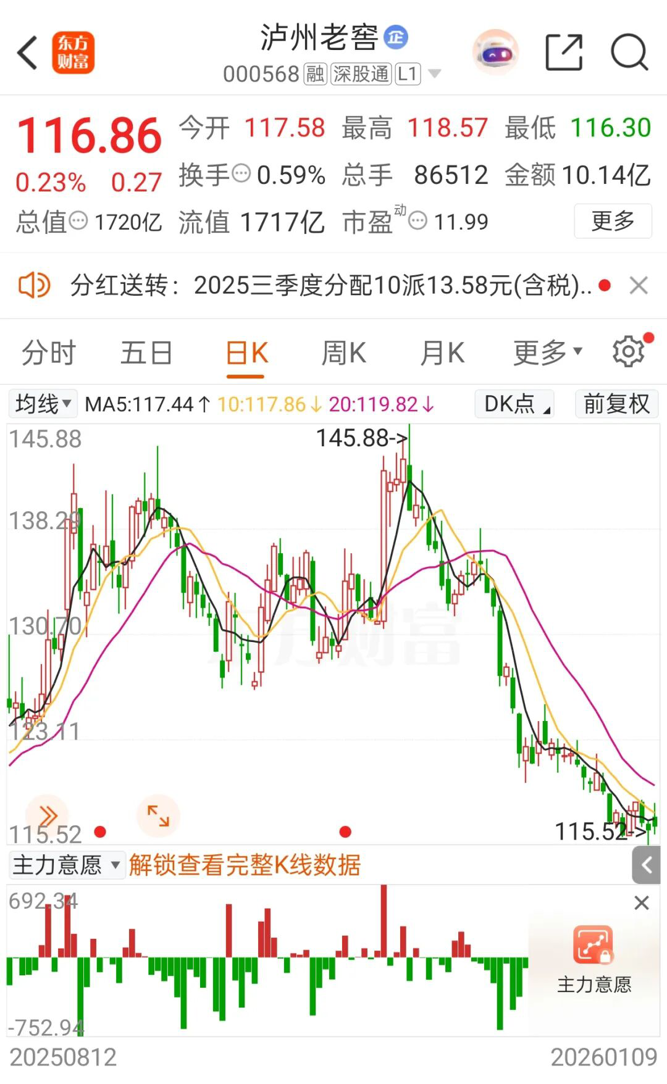 截至1月9日,泸州老窖报116.86元/股,上涨0.23%,总市值为1720亿元,滚动股息率为5.36%。